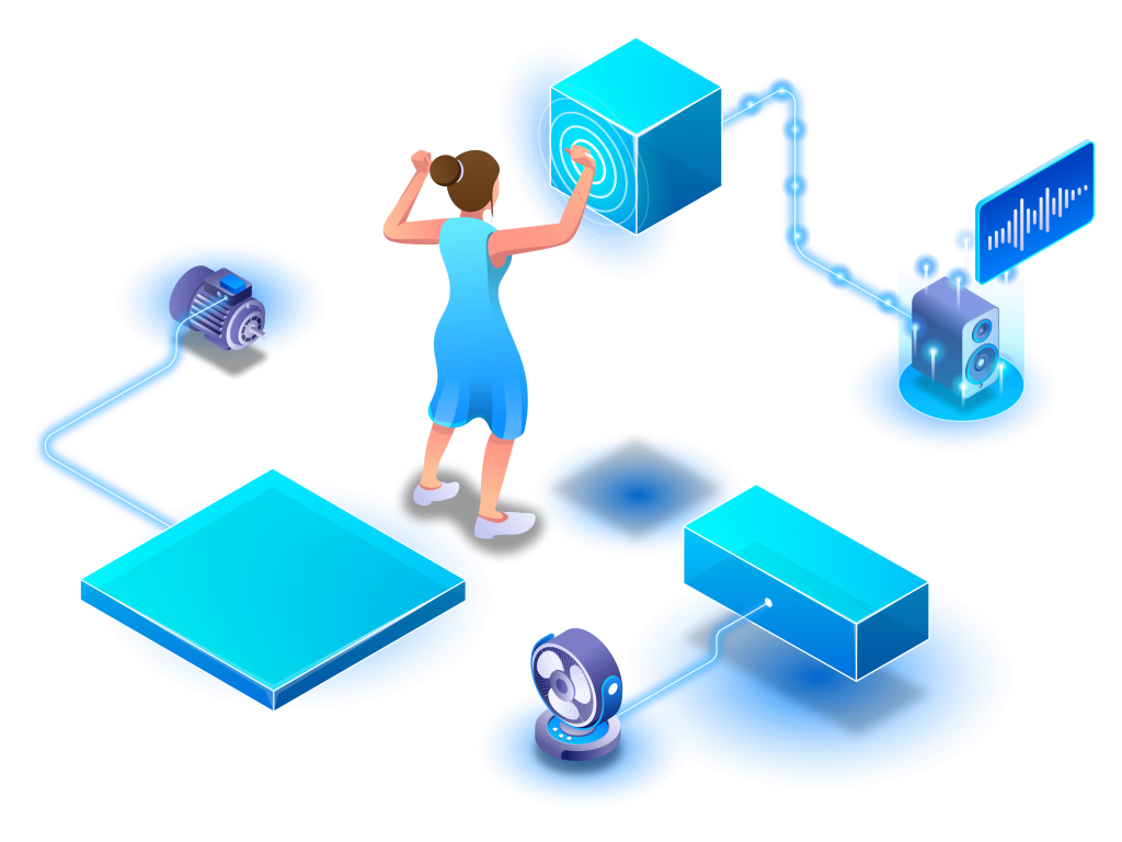 The system is capable of creating virtual 3D zones within the user’s space, effectively setting up invisible interaction areas. When a user enters these zones with any part of their body the system recognises this entry, and triggers predetermined actions across various technologies. This feature adds an extra layer of interactivity, allowing for more complex and engaging experiences. Whether it’s activating lighting effects or starting a machine, entering these 3D zones initiates real-world or digital responses