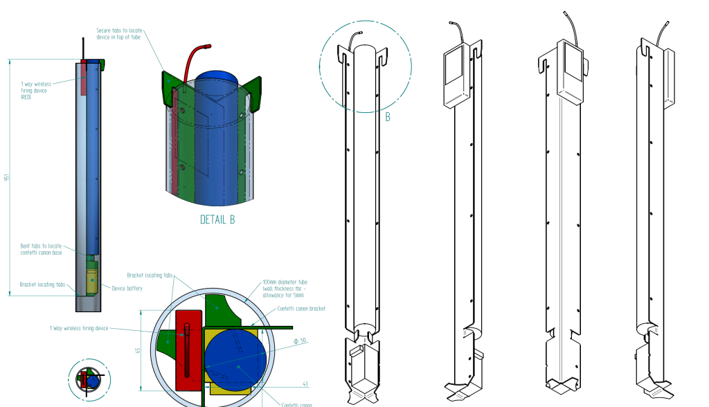 Full technical drawings had to be submitted to production prior to the creation of the hardware. As fitment was in scenic pieces being constructed by a South American supplier, consideration about the flexibility of installation was needed. The final design was developed from a single folded piece of steel and was compact and stackable for easy transport. The design incorporated fitment for a power supply, wireless firing device and the confetti launching equipment.